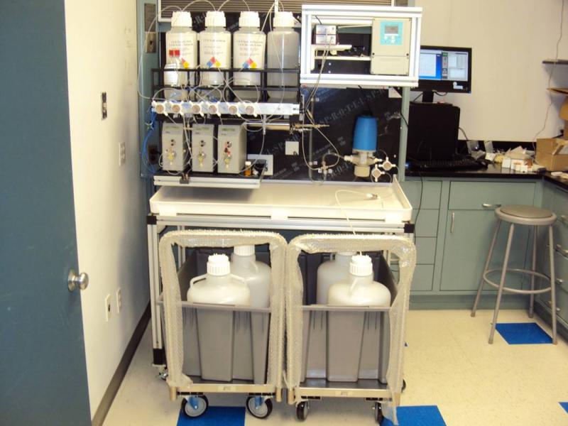 The entire system was mounted on a portable platform capable of passing through a typical laboratory door to facilitate ease of transport between production facilities. In addition, reception vessels were designed such that the product could be continuously removed throughout the production run to facilitate analysis and further processing. As part of the project an analysis system consisting of an HPLC with LC/MS detection was designed to provide complete quantitation of reagents, intermediates and final product.