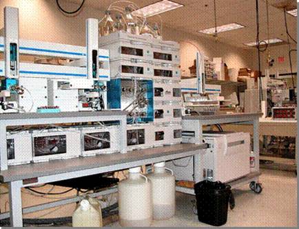 The system was controlled by software, which allowed the system to run unattended. The separations units contained many columns to separate reaction mixtures and recover purified product. Included in the system are; 4 preparative chromatographic pumps; two analytical chromatographic pumps; two dual arm autosamplers with temperature controlled sample handling capability; valve switching module; two UV detectors; one MS detector; one fraction collector; solvent and waste containers. The system is used continuously to screen and purify compounds of medicinal interest.